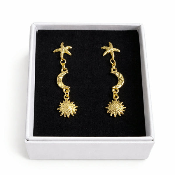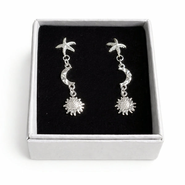 Moonie ørestikker i 925 ægte sterlingsølv med et fint design af søstjerne, halvmåne og sol.