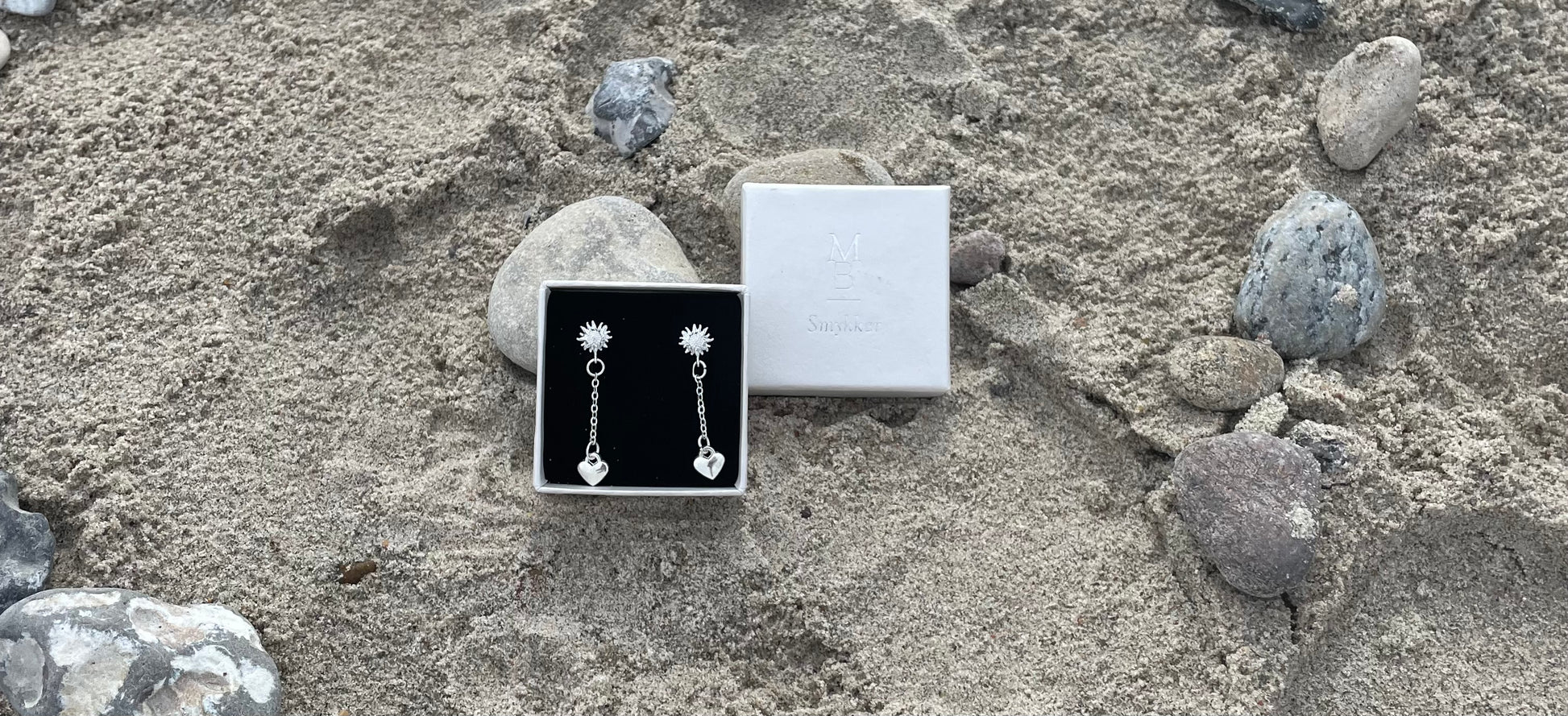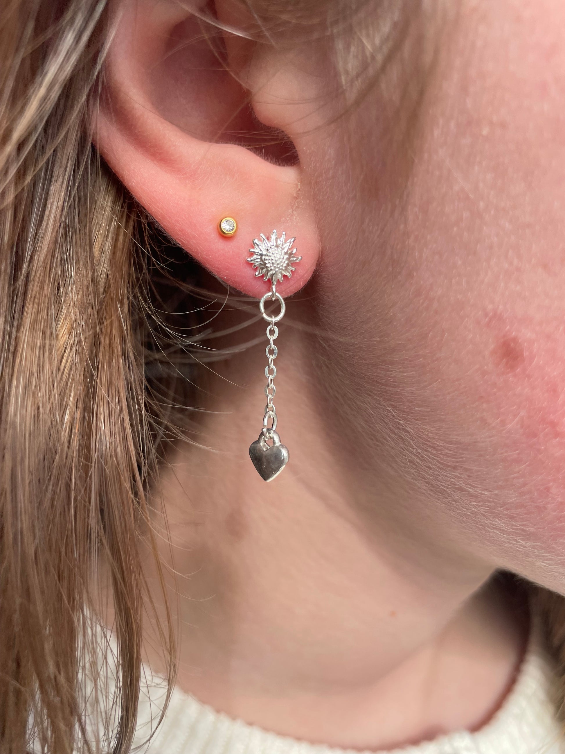 Sunkiss er et meget simpelt sol - ørestikker med en lille kæde med et hjerte for enden af kæden.